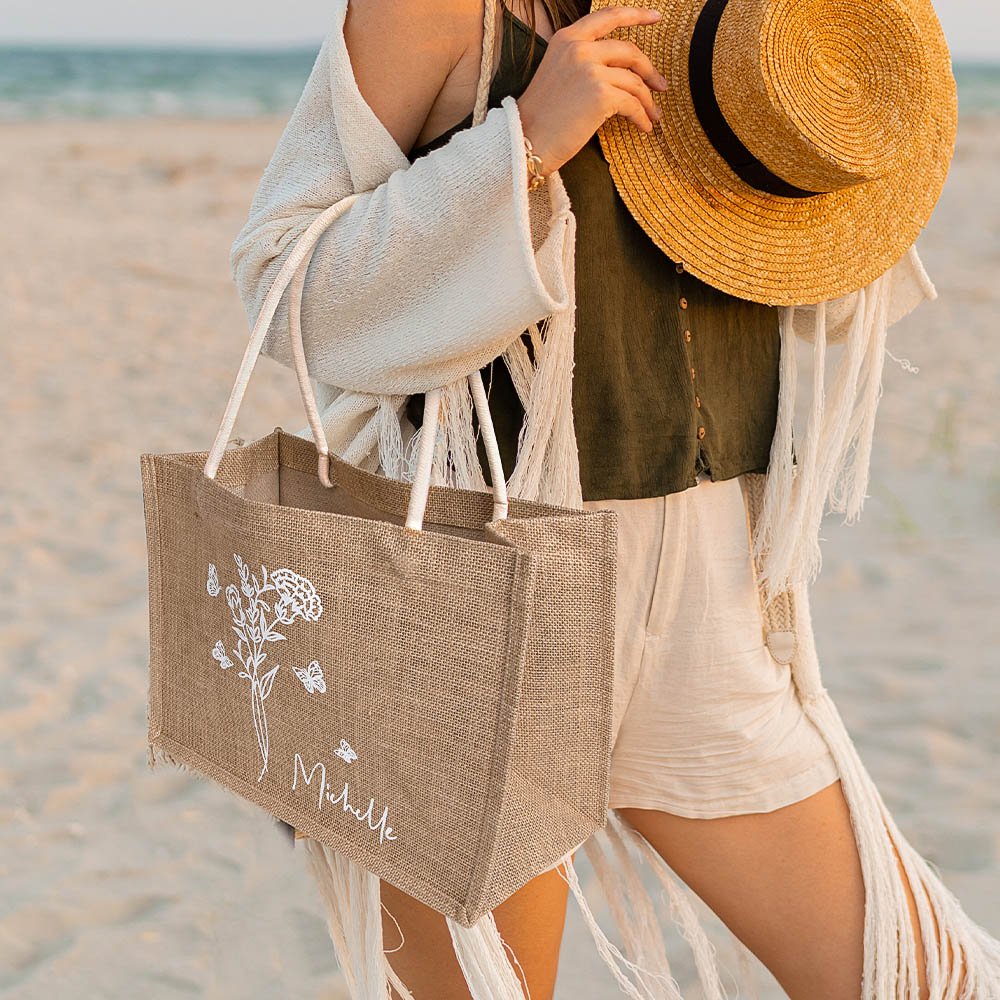 This personalized butterfly and flower burlap tote bag is an ideal gift for bridesmaids, a thoughtful gesture for bridal shower attendees, or a charming addition to any wedding party gift set.