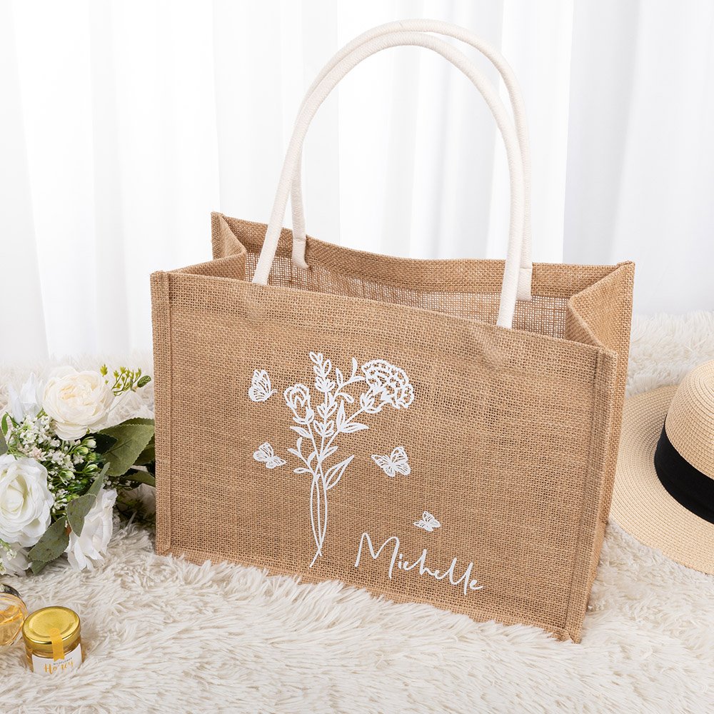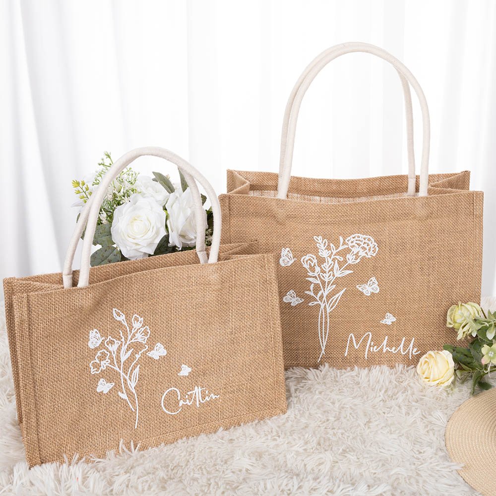 Personalized Butterfly and Flower Jute Tote Bag with Name Bridesmaid Bridal Shower Wedding Party Gift for Her