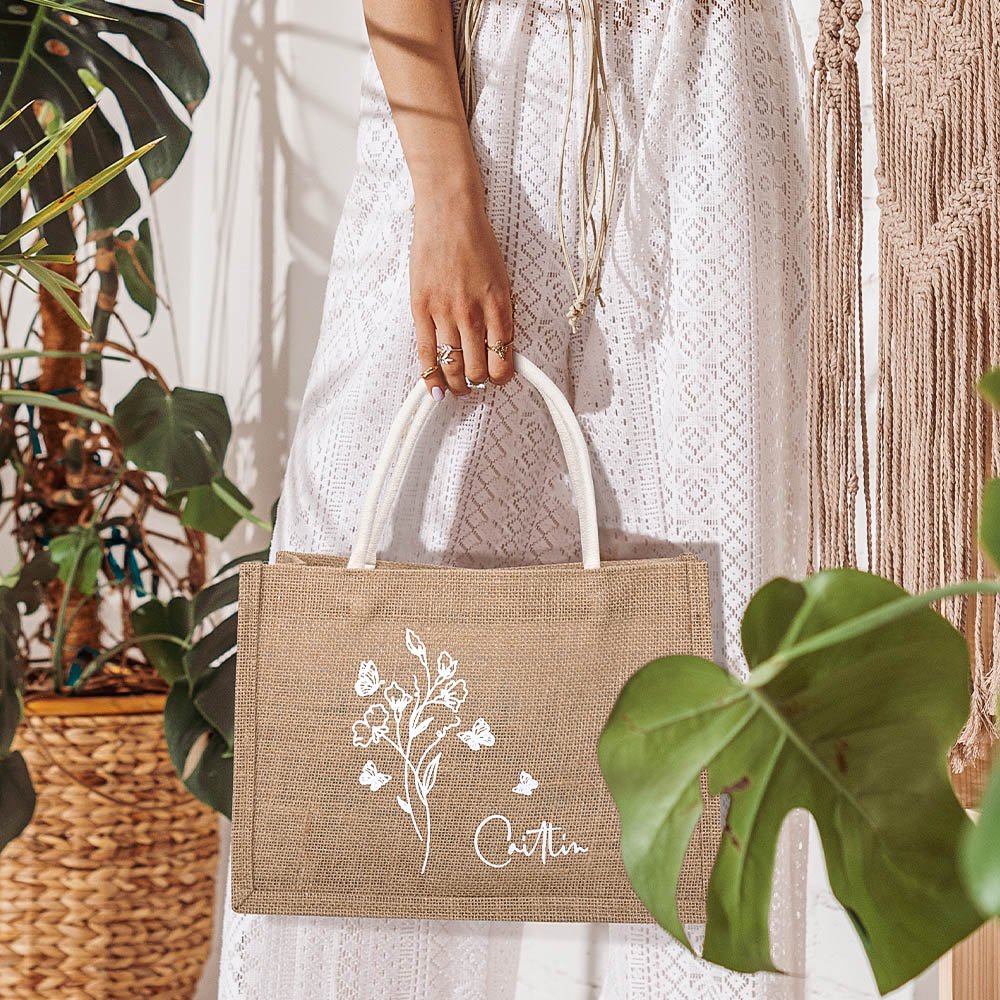 The tote bag is adorned with a beautiful birth flower and butterfly design, capturing the enchantment of a tranquil garden. Vibrant butterflies flutter amidst the personalized birth flower, creating a lively personal. Each bag can be personalized with the recipient's name, making each piece unique and thoughtful.