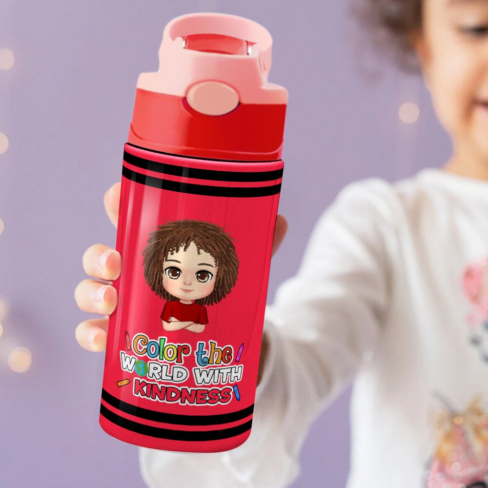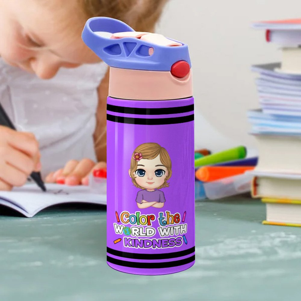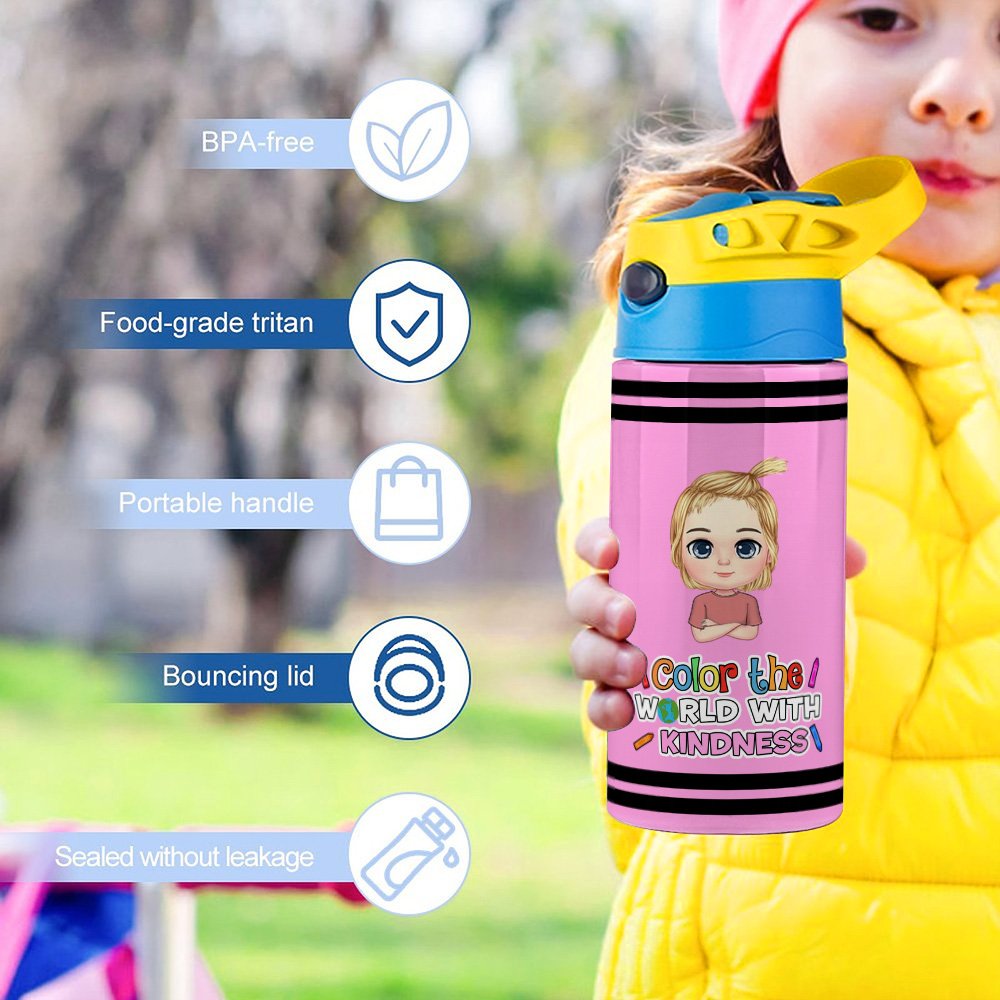 This water bottle offers multiple color options and features customizable cartoon character designs and the phrase "Color the world with", which adds a unique touch. Besides, the bottle supports the input of your desired text and your child's name, creating a unique and stylish drinking utensil for your child.